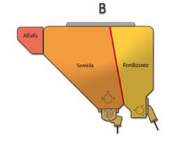 | Cap. tolva de fertilizante (Lts.) | A - 760 Lt - 610 Kg. | B - 540 Lt. 430 Kg. | |||